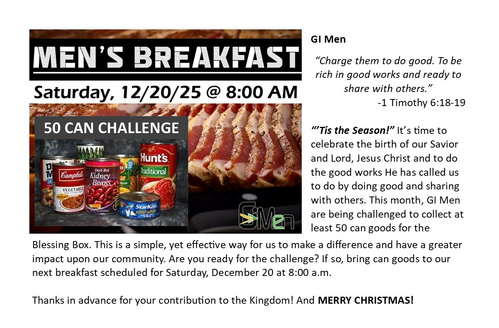 Greetings All! I’m looking forward to seeing you on October 19 at 8:00 a.m. for Men’s Breakfast.